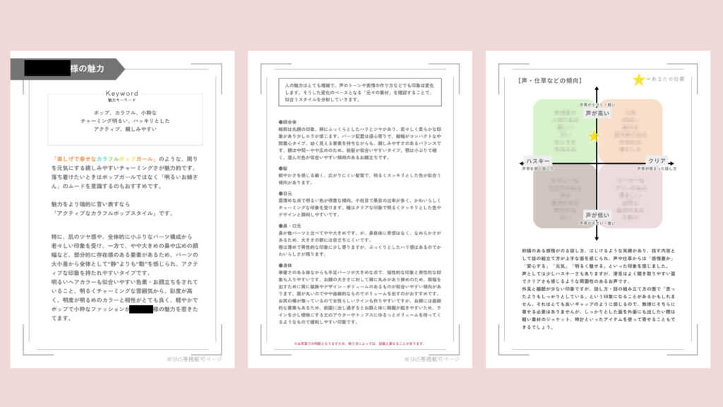 動画・またはZoom(※追加オプション)にて声や仕草などの傾向と齟齬の埋め方をアドバイスとして記載しております。
