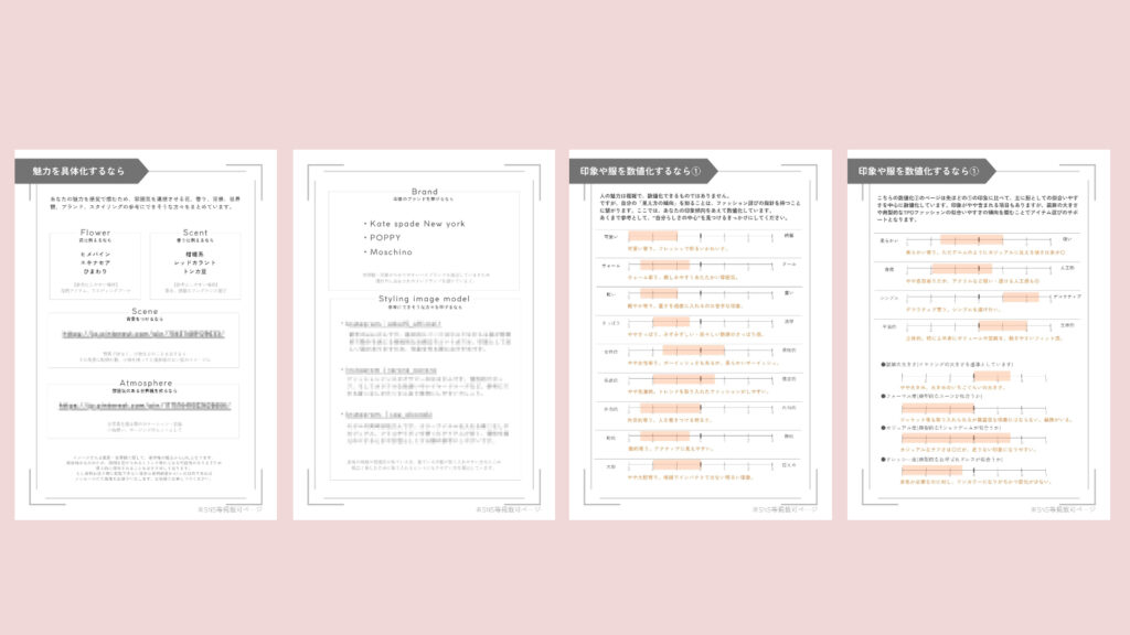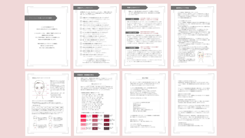 資料自体はパーソナルカラー春、骨格ウェーブ、顔タイプフレッシュ、パリ流クリエイティブ×スポーティーの方のものです。