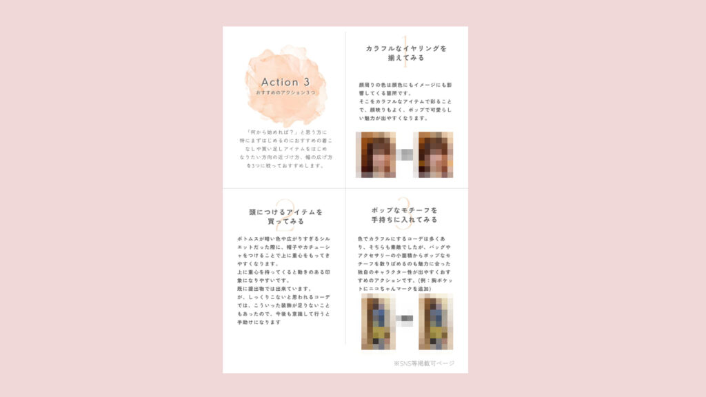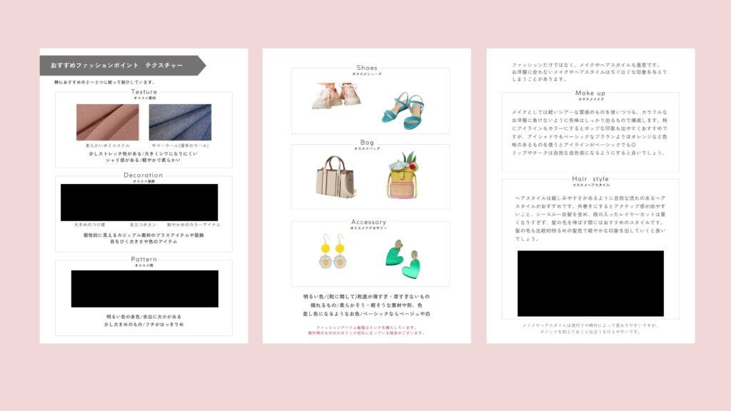 着こなしのアドバイスや、お好みのテイストを似合わせに近づけるためのアドバイス、買い足しすると幅がグっと広がったり魅力がアップしやすいアイテム、また既に出来ている方に関しては幅を広げるためのアドバイスを記載することがございます。