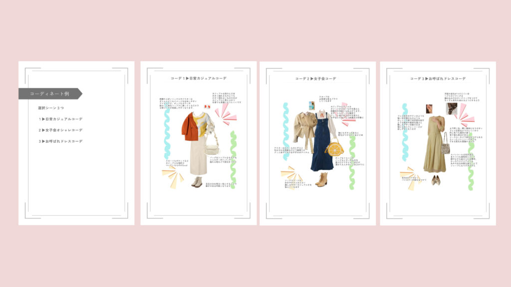 コーディネートの内容は事前アンケートで選択できる方式となっております。→シーン別コーデ一覧はこちらの下部で確認できます